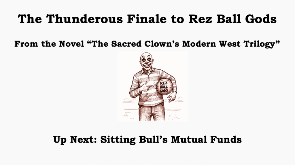 “Unadulterated bullshit!” the color of He She’s cheeks now matched the purple sky. “There was nothing wrong in 1942 and even less so today. These Indians want us to feel sorry for them. We built them a dam and brought law and order to a bunch of ungrateful criminals and their supporters. I would remind the board that the Fort Laramie Treaty of 1851 was silent about basketball. There’s not a word in the whole damn document about sport. For you to try to make new laws where they don’t exist is a miscarriage of justice!”